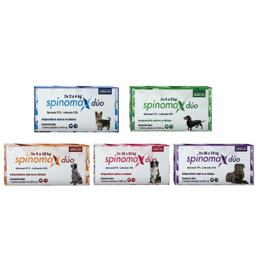 El Spinosad comienza a eliminar las pulgas aproximadamente 30 minutos después de su administración, con una eficacia cercana al 100% a las 4 horas post tratamiento. El Lufenurón presenta actividad ovicida al inhibir la formación de quitina y la eclosión de los huevos, interrumpiendo el ciclo biológico del parásito. Actúa también sobre las larvas en el ambiente, impidiendo su desarrollo a adultos. La eficacia del Spinosad y el Lufenurón persiste por aproximadamente 30 días, por tanto Spinomax Dúo tiene un excelente poder preventivo de